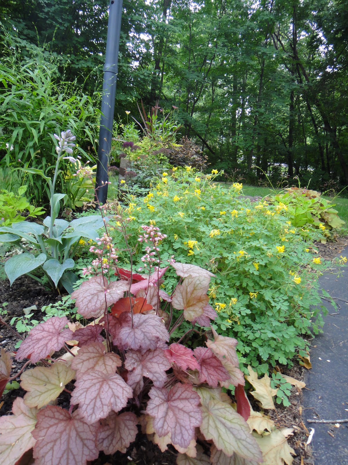 The lightpost bed is still the most colorful area of the garden. Huechera and Corydalis lutea are blooming, the barrel has filled in. Even the grass is adding some “flowers”. Over in the walnut bed, only things in bloom are the corydalis, and a small little hosta. That in this diminuitive form the flowers are kinda charming.