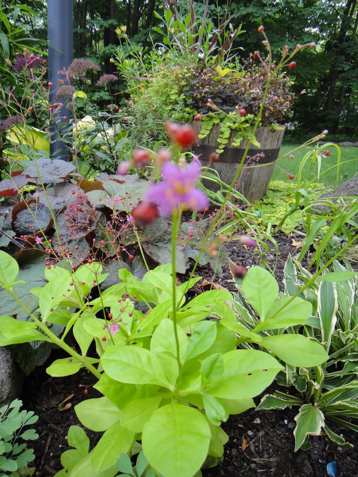 The area I think of as the lampost bed is filling in nicely. Planted the barrel with annuals a couple weeks ago, but it really is the perennials stealing the show – and proving the value of foliage for color in a garden. Love the brightess of the yellow foliage in this shaded yard.