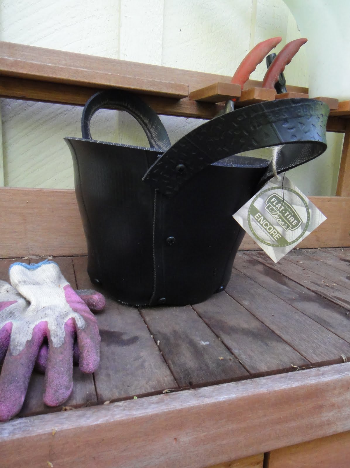 Flat Tire Decor is a Milwaukee (West Allis) based company that recycles/reuses old tires by turning them into footwear and other products. Milwaukee company and keeping tires out of landfills, how great is that? I received their largest basket, the ‘Newport’, a two handled trug-type shape that’s about 8″high with an 8″ base and 12″ top opening. (Milwaukee folks – you can get these at any of the 4 Elliott’s Ace Hardware stores)