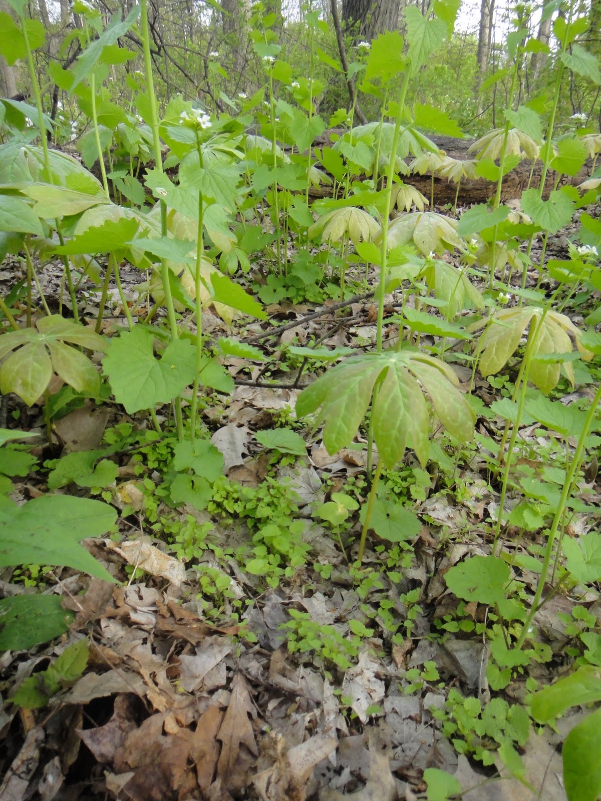 However, within this all lurks a bit of evil. Masses and masses of Garlic Mustard (Alliaria petiolata), a noxious weed, introduced from Europe and threatening native plants throughout the Midwest. And I do mean masses. In clusters together, between the other plants, Best controlled by pulling, which when at flowering height is easy. However, lurking below millions and millions of tiny seedlings. I’ve read a single plant can produce 50,000 seeds, seeds that remain viable in the soil for 6 years. Garlic Mustard plants are alleopathic producing chemicals in the soil that inhibit the growth of other plants.