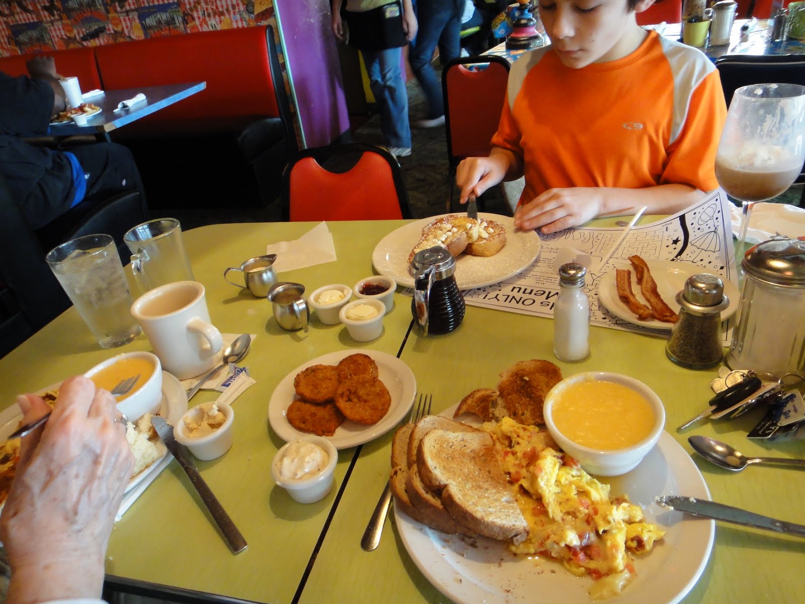 Don’t let these pictures fool you. The place is usually packed. This was mid-morning on a Monday. Not exactly prime time. As we were leaving the lunch crowd was beginning to arrive. Love how every inch is decorated. Even the bathrooms! Fun touches (and puzzles on the tables). Kiddo and I enjoyed a nice game of Would you rather…