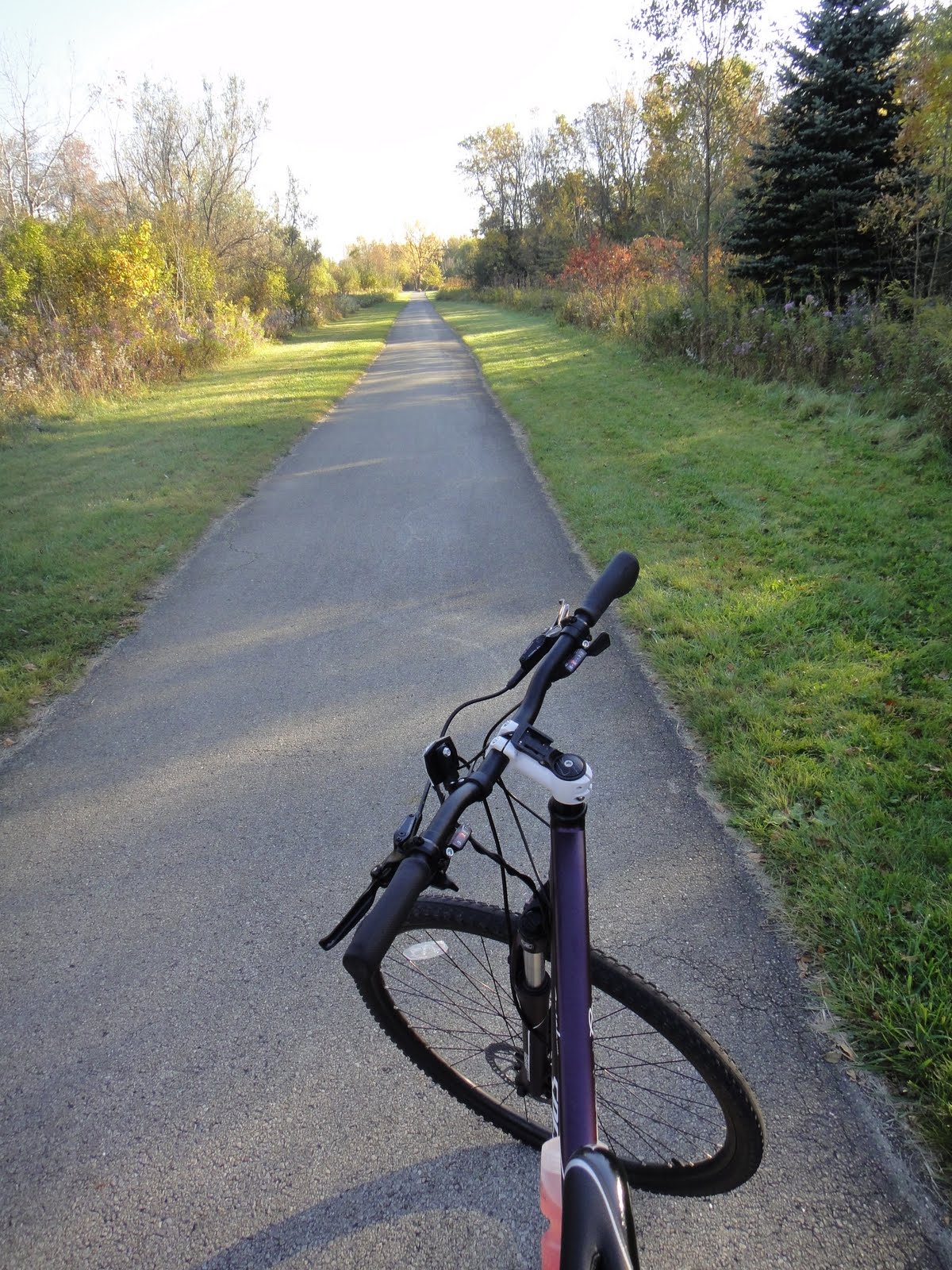 Tho’ my FaceBook and Daily Mile friends are probably tired of hearing me complain about the ride home being harder, more uphill. Which it is. And god knows, I’m much more of the slow, steady and consistent effort ilk than the power up hills type. However, if I want to also take up mountain biking, that needs to change. Using the commute to work on standing to pedal up hills, mashing if necessary, using the downhill by Hansen Golf Course (and bumpy pavement) to practice a MTB descent, up off the saddle, slightly behind the seat, feathering the brakes. Maybe some day I’ll be doing hill intervals on Hillside Dr. on my way home, instead of bitching about it, all the while wishing I could find a flatter route through Elm Grove.