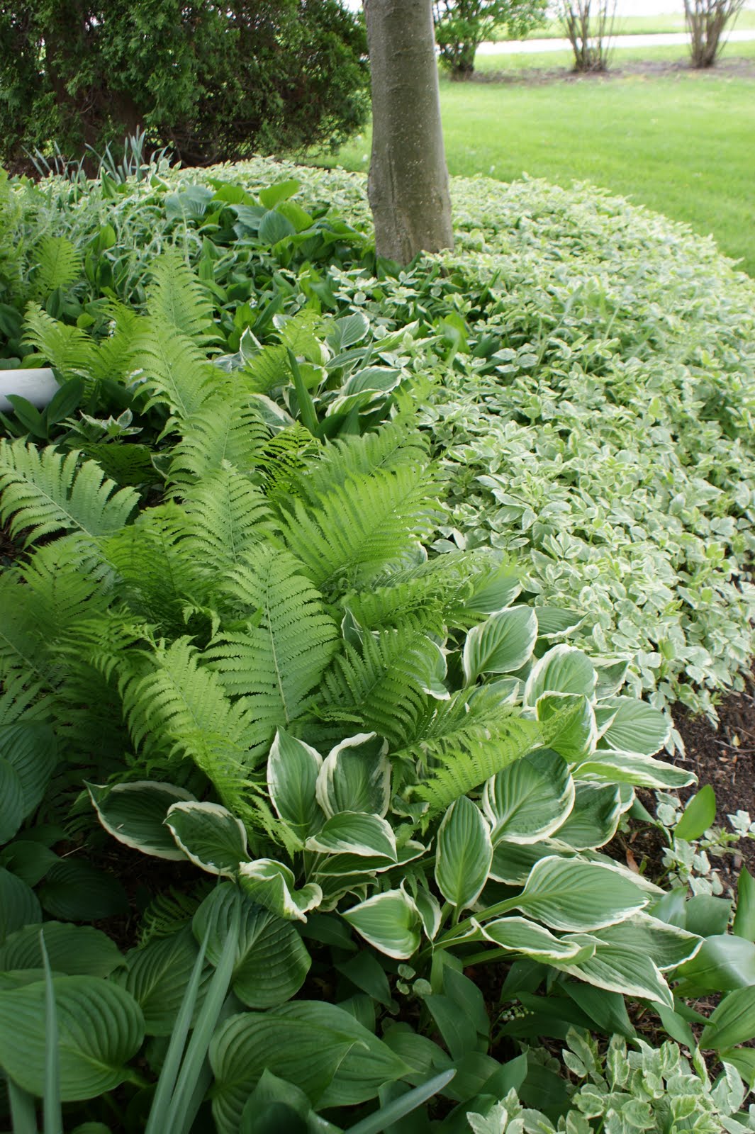 I’ll take lessons from the side of the house where Mom says she doesn’t mess with – letting the plants spread as they may. Lesson one – I found the green white color scheme soothing, calming. It is one I will use in my own garden. Lesson two – skip the Snow in the Mountain, which is probably the influence behind the let the plants go attitude.