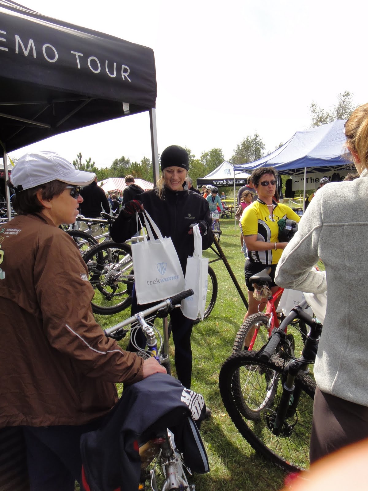 Even with that fall (ok, 2, but who’s counting), really loved the day. Mountain biking brings an entirely different aspect into riding. On the road, there’s a rhythm to riding that becomes almost hypnotic, mindless; while mountain biking requires a constant connection with the bike. Getting off your saddle, shifting weight forward and back, holding pedals in a position to not hit rocks or roots, finding lines. All provide a challenge, a change. Still love the road bike, but can tell I will do more of this style of riding. Having the opprotunity of learning this within a group of women was a bonus, a huge bonus. (Thanks, Trek!!) And they even gave us gifts, and not to mention let us ride some great bikes.